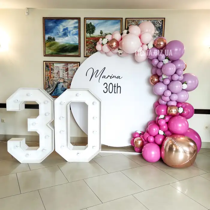 Фотозона круглая белая "30 лет" со светящимися цифрами