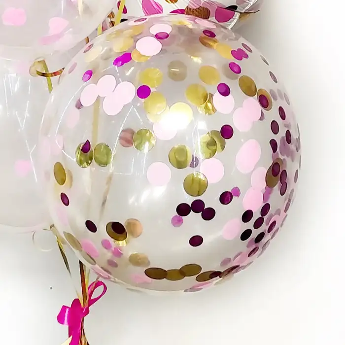 12" Прозрачный с конфетти "Круги золото, розовые и мини круги малиновые"