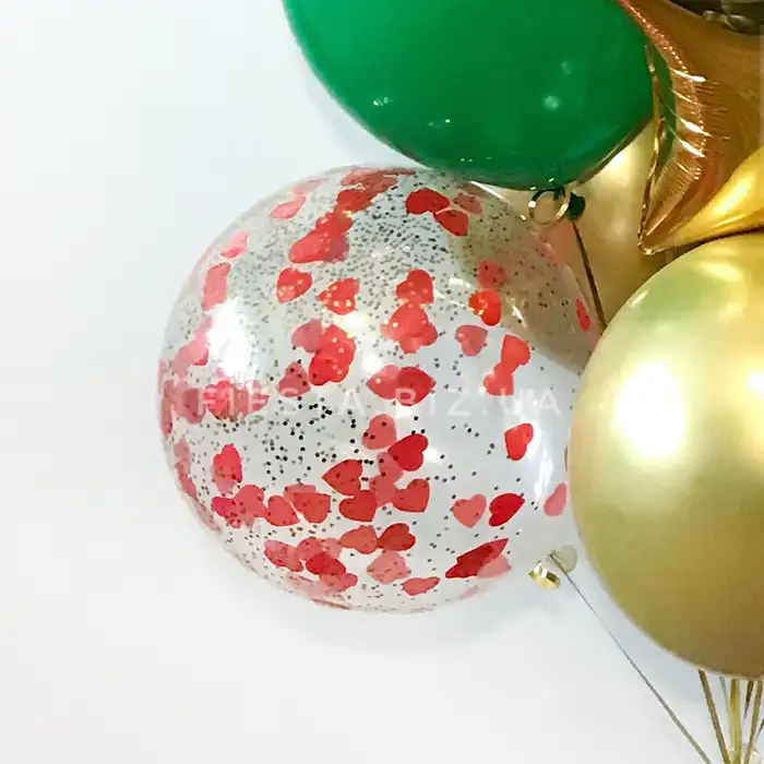 12" Прозрачный с конфетти "Сердца красные и золотые чешуйки"