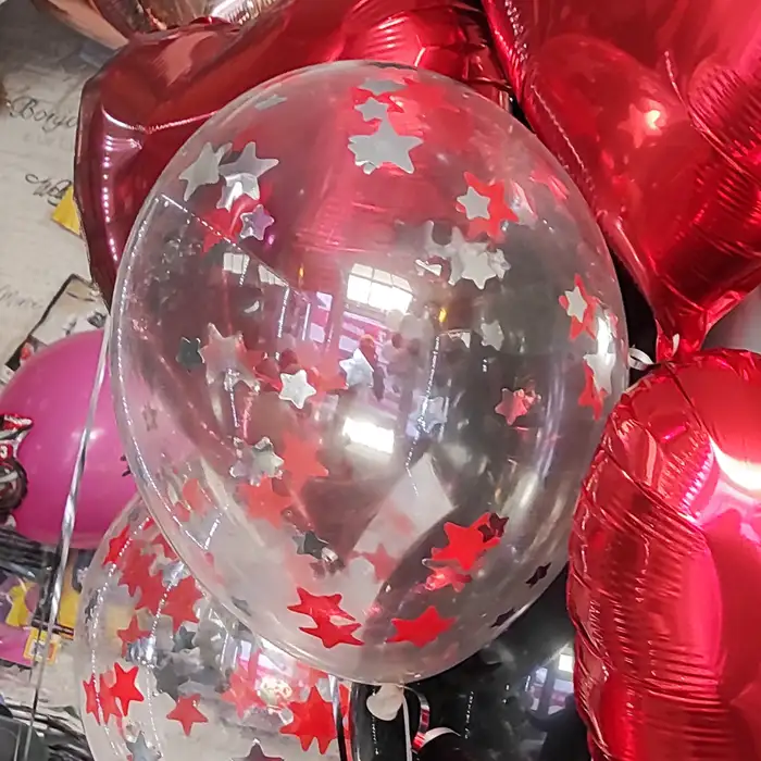 12" Прозрачный с конфетти "Звёздочки красные, звёздочки серебро"