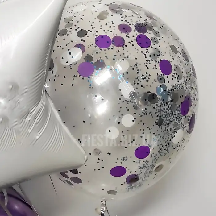 12" Прозрачный с конфетти "Круги белые, фиолетовые, серебро и синие чешуйки"