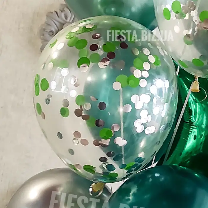 12" Прозрачный с конфетти "Круги зелёные и серебристые"