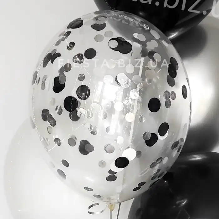 12" Прозрачный с конфетти "Круги белые, серебро, чёрные)