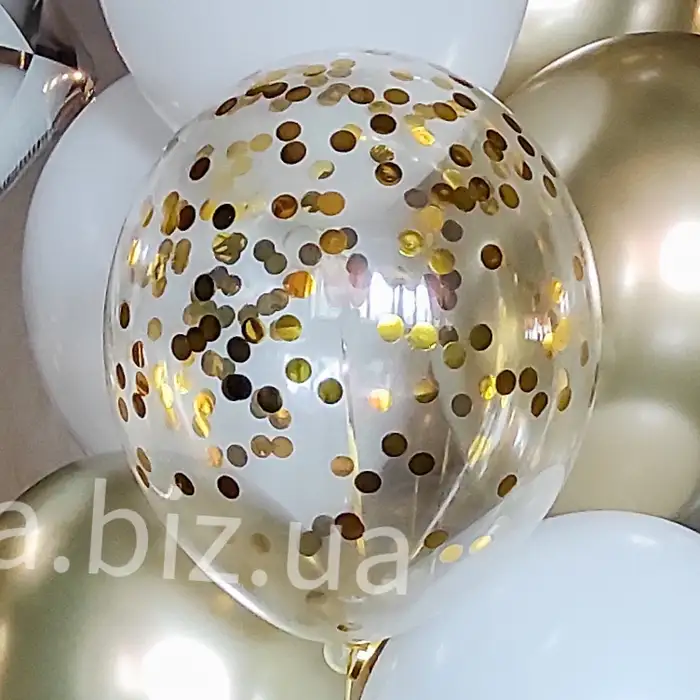 12" Прозрачный с конфетти "Круги белый, голубой, зелёный, мини круги золото"