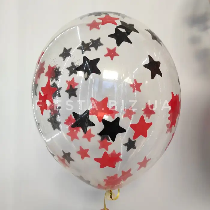 12" Прозрачный с конфетти "Звездочки красные и чёрные"