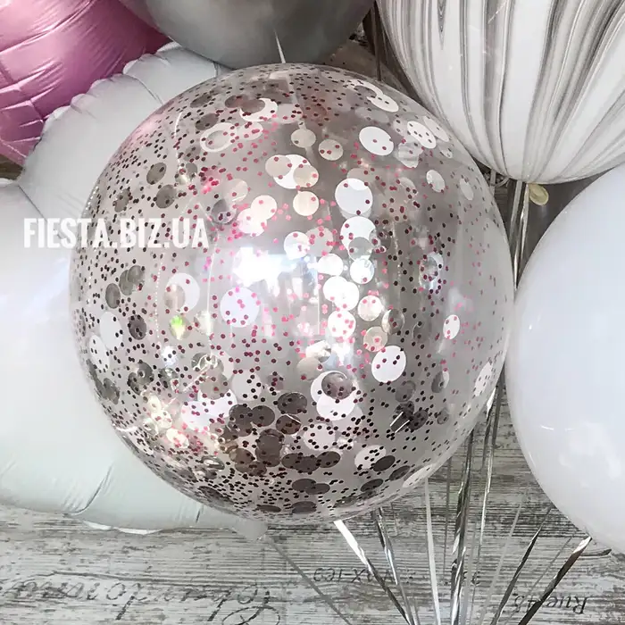 12" Прозрачный с конфетти "Круги белые, мини круги серебро, чешуйки розовые"