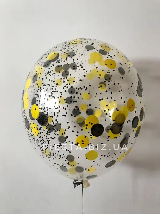 12” Прозрачный с конфетти "Круги жёлтые, круги чёрные и чешуйки чёрные "