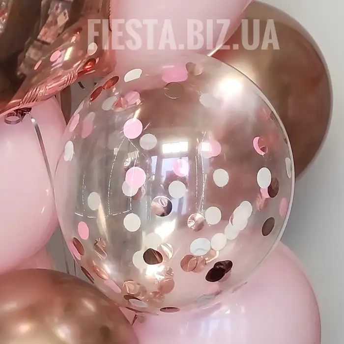 12" Прозрачный с конфетти "Круги белые, розовые и розовое золото"