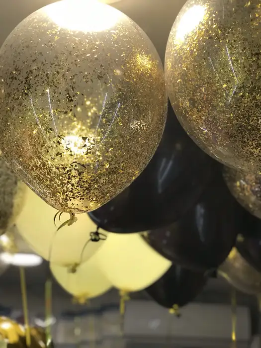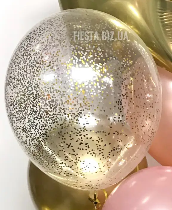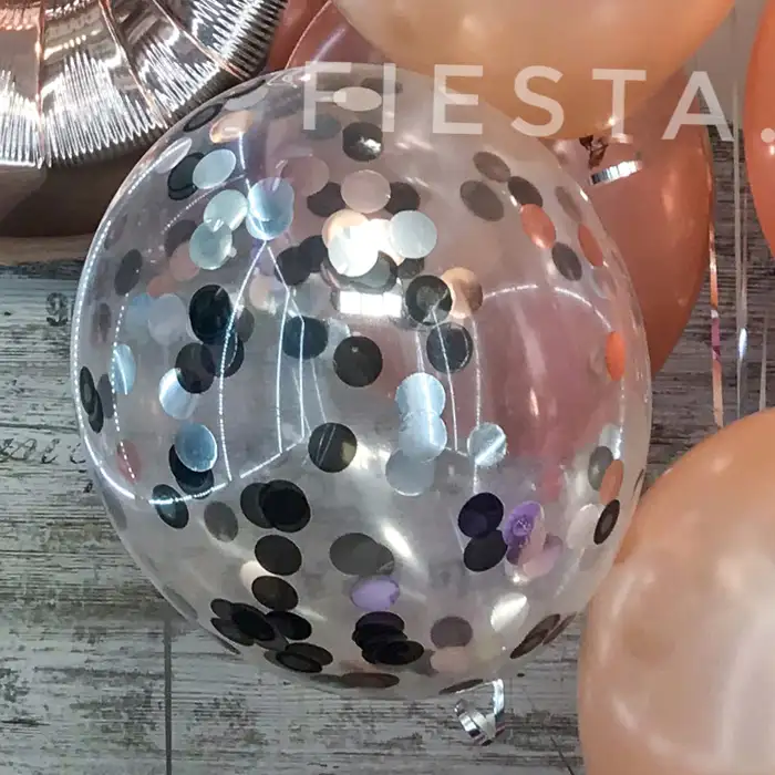 12" Прозрачный с конфетти "Круги серебро, розовое золото и чёрные "