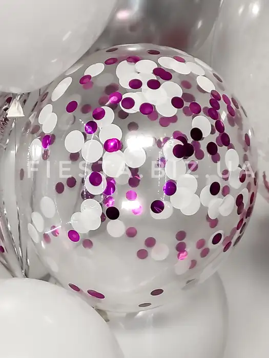 12" Прозрачный с конфетти "Круги белые и мини круги малиновые "