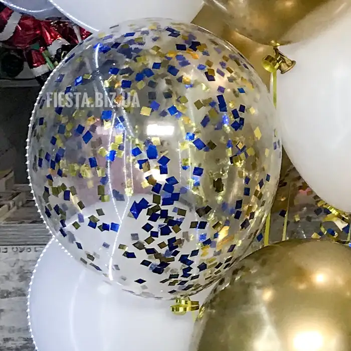 12" Прозрачный с конфетти "Квадратики золото, квадратики синие"