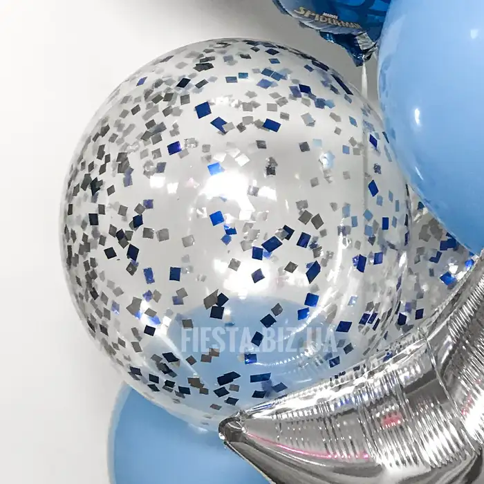 12" Прозрачный с конфетти "Квадратики синие и серебристые"