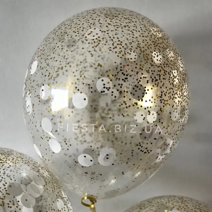 12" Прозрачный с конфетти "Круги белые + золотые чешуйки"