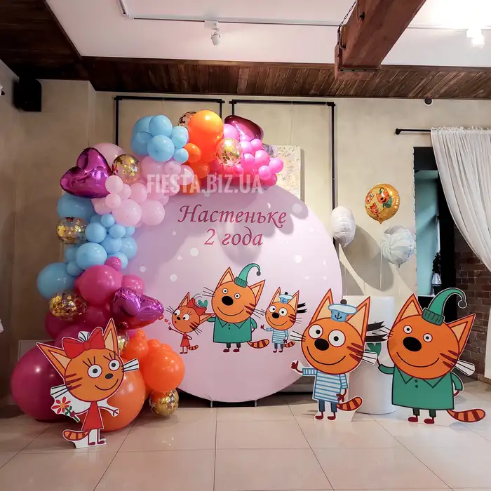 Фотозона круглая розовая "Три кота" с разработкой дизайна